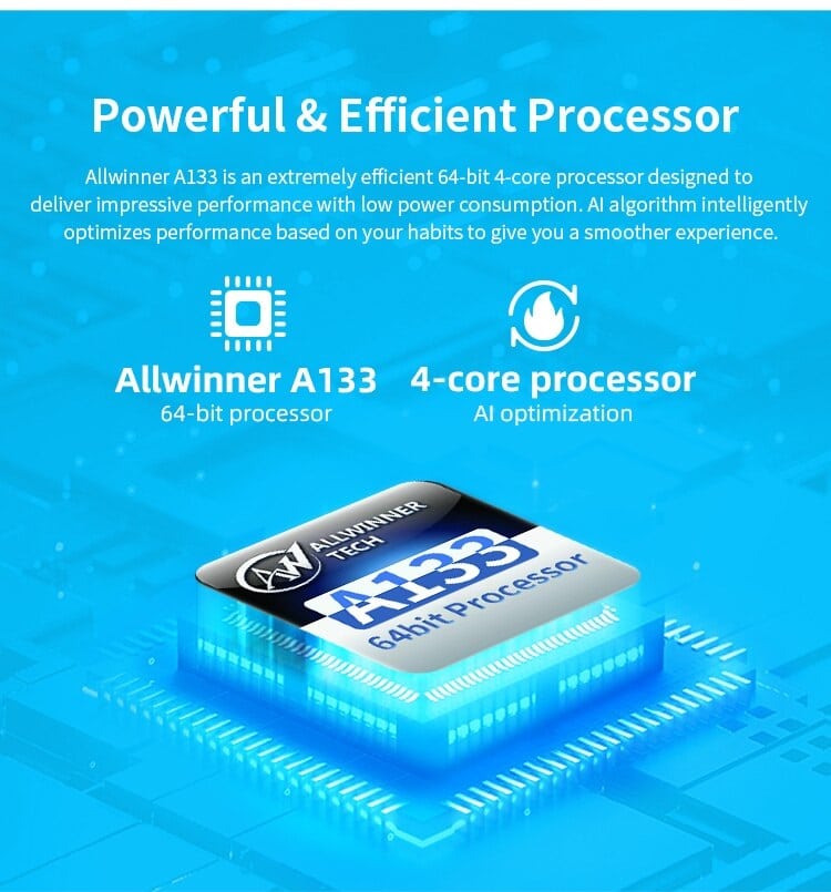 • CPU: A133P Quad-core (4×Arm Cortex-A53@1.8GHz)