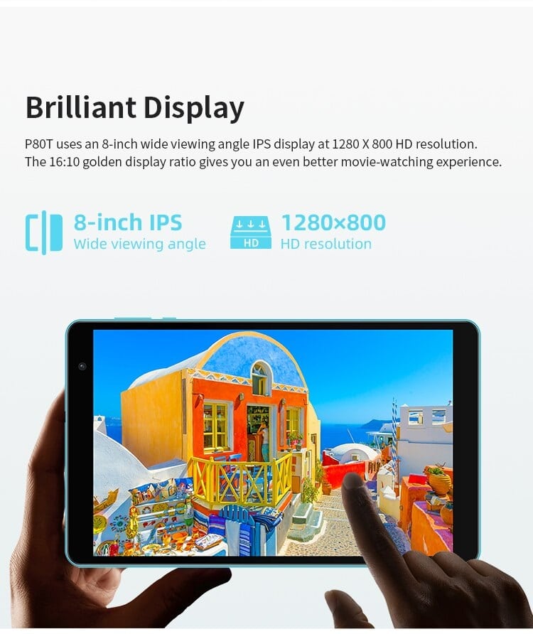 Het heldere 8-inch IPS-display met een resolutie van 1280×800 (FHD) biedt levendige kleuren, brede kijkhoeken en een comfortabele 16:10 beeldverhouding, geoptimaliseerd voor video’s, games en leeservaring onderweg.