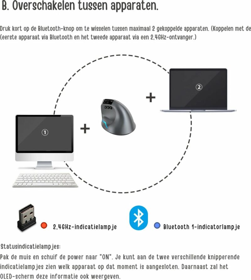 Twee draadloze verbindingsmodus: Deze draadloze muis biedt twee verbindingsmodi’s: USB 2.4G draadloze modus en Bluetooth-modus. Je kunt verbinding maken door de ontvanger op de USB-poort van je apparaat aan te sluiten of via Bluetooth (het apparaat moet Bluetooth-functionaliteit hebben). Het kan tegelijkertijd verbinding maken met twee apparaten en vrij tussen deze apparaten schakelen. Om een voorbeeld te geven, je kan eenvoudig en snel de muisbediening overschakelen van een pc naar een laptop, tablet etc.