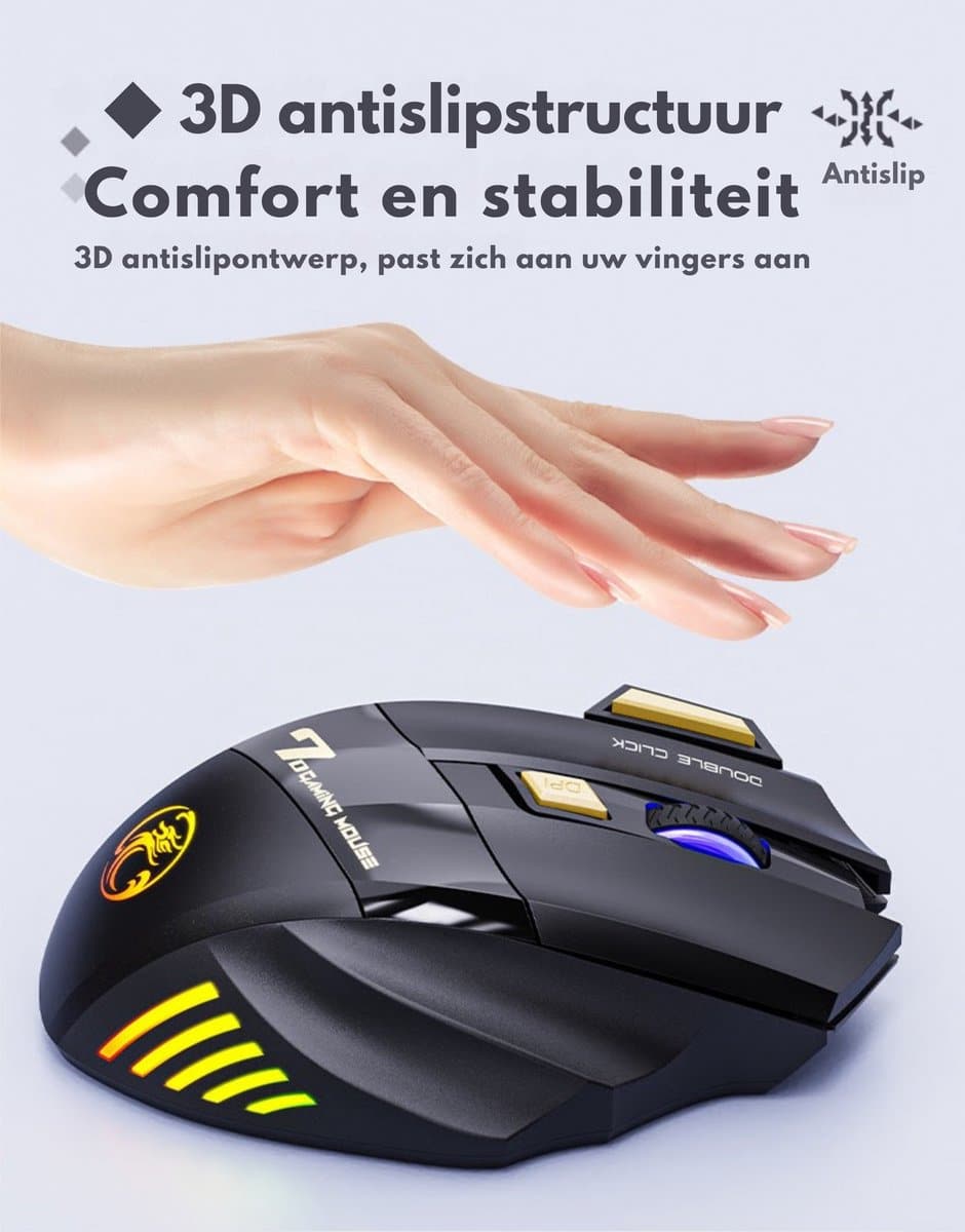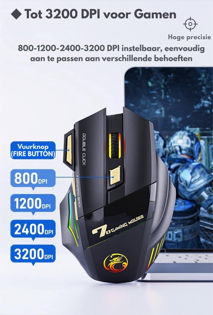 Zeven knoppen voor volledige controle: Voor maximale functionaliteit beschikt deze muis over 7 slim geplaatste knoppen, waaronder een dubbele klikknop, een DPI-schakelaar, vooruit- en terugknoppen en een speciale vuurknop. Dit maakt hem uitermate geschikt voor gamers die snel willen schakelen tijdens intensieve sessies, maar ook voor professionals die efficiënt willen werken met sneltoetsen binnen programma’s of browsers.