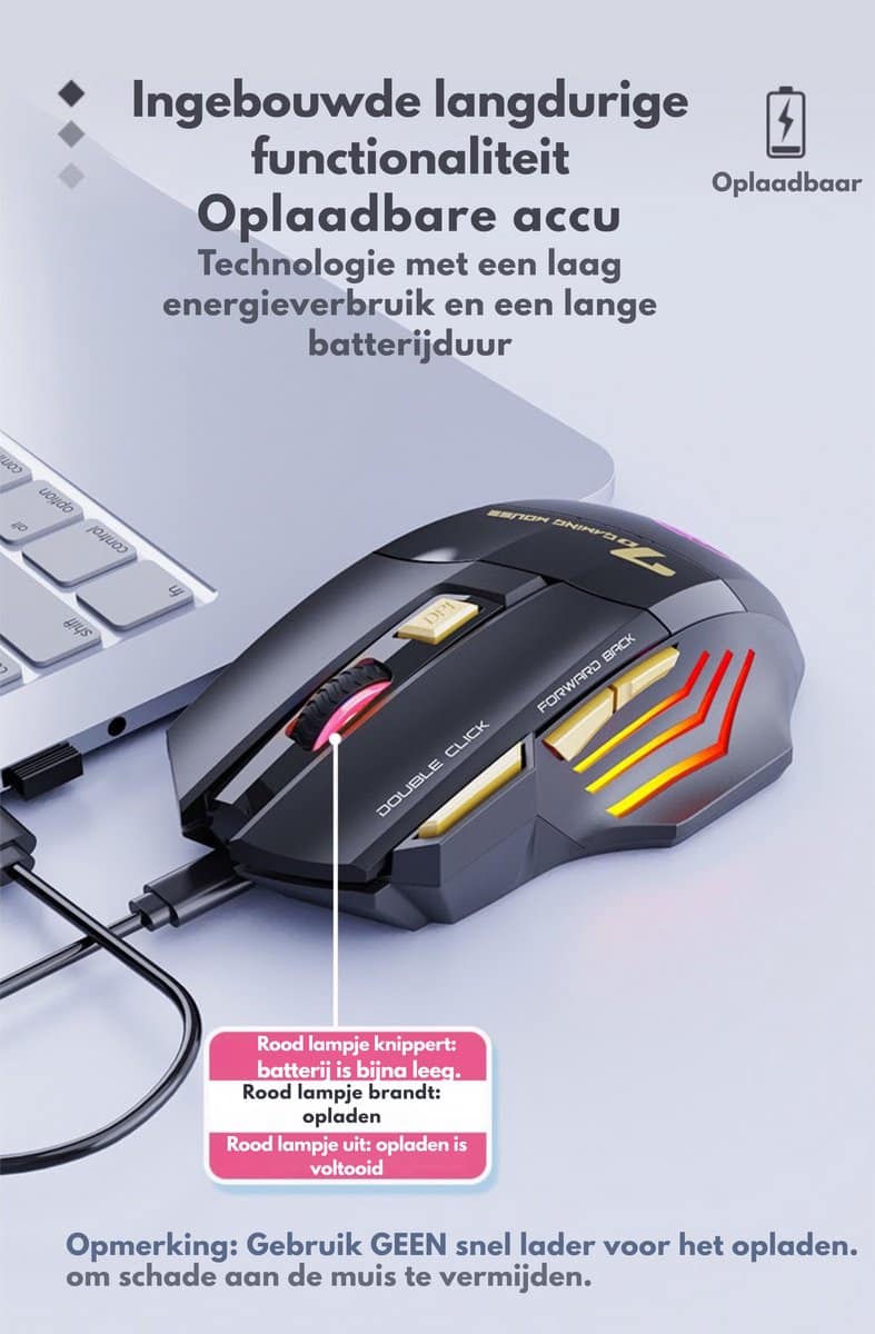 - Werkspanning: DC 3,7 V ± 5% ( Gebruik geen SNEL LADERS, dit om schade aan de muis te vermijden. Gebruik altijd een 5V lader)